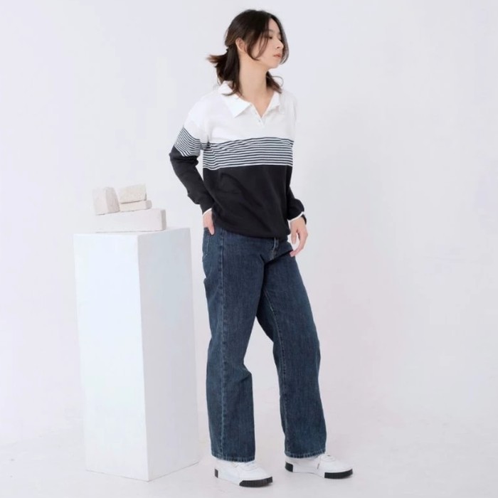 Polo knitwear dengan model kerah bisa menjadi pilihan outfit dalam berbagai acara formal dan casual. Kamu bisa memadukan dengan celana bahan untuk tampilan formal dan jeans untuk casual. Atasan knitwear ini memiliki motif garis-garis dengan kombinasi warna-warna yang cantik. Cocok untuk kamu yang ingin tampil sat set dan bergaya boyish.