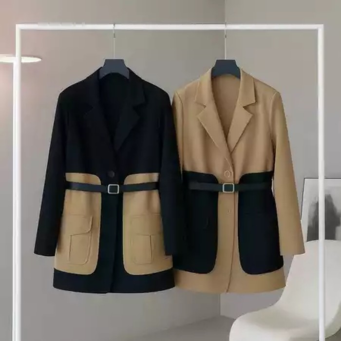 Bosan dengan blazer satu warna yang terkesan monoton, kamu bisa pilih blazer satu ini. Hadir dengan dua warna hitam dan moca yang didesain sangat modern. Lengkap dengan dua kantung dibagian depan dan ikat pinggang yang membuat tampilan semakin elegan.