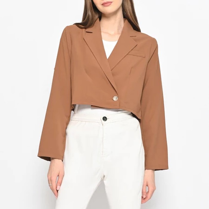 Berbeda dengan blazer pada umumnya, blazer satu ini didesain dengan tampilan crop top. Namun, tetap dengan lengan panjang dan kancing di bagian depan, seperti layaknya blazer. Lengan panjang hingga 56 cm dan panjang blazer sampai 50 cm, serta lingkar dada 100 cm.