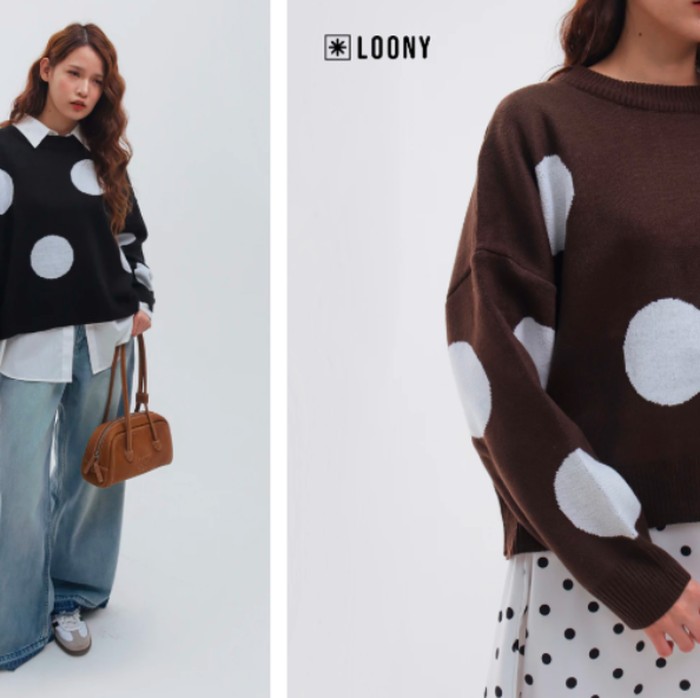 Polka lovers, kalian wajib punya yang satu ini! LOONY menghadirkan sweater motif polkadot besar yang playful tapi tetap stylish untuk musim hujan. Terdapat warna black dan brown yang keduanya punya vibe chic dan bold. Bahannya Premium Knit, super lembut, dan yang paling penting bisa menyerap keringat. Ini penting saat cuaca tidak menentu, karena tubuh tetap hangat tanpa terasa pengap. Sweater ini juga punya cutting yang oversized sehingga memberikan kesan unisex dan super nyaman dipakai di hari-hari dingin. Cocok buat kamu yang mau tampil santai tapi tetap standout.