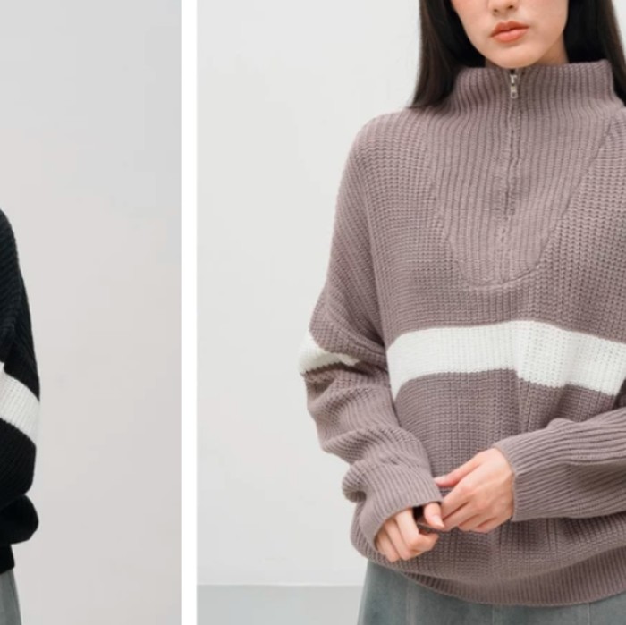 Kalau kamu suka sweater polos yang simpel tapi tetap berkelas, Cori Zipper dari RUBI Knitwear wajib kamu masukkan wishlist. Tersedia dalam wood brown, black, brokwn white, pewter grey, dan green army, semua warnanya memberi kesan calm dan elegan untuk outfit musim hujan.