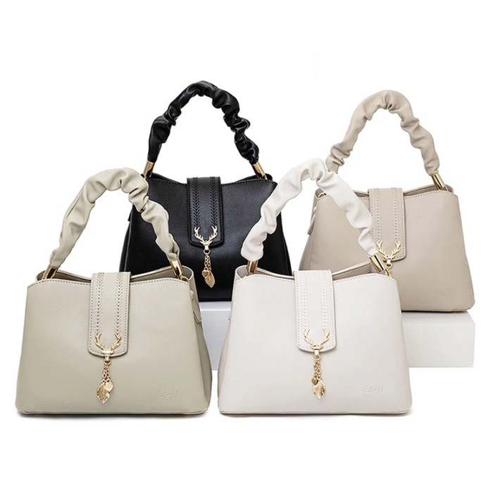 Rekomendasi selanjutnya adalah En-ji yang merupakan sister brand dari PALOMINO BAG. Handbag dengan detail kerut pada handle dan aksen bag charm di bagian tengah akan memberikanmu look berkelas dan elegan, Beauties. Selain handbag, terdapat tali panjang yang dapat kamu gunakan sebagai sling bag. Dengan harga Rp200 ribuan, kamu sudah mendapatkan tas cantik ini.