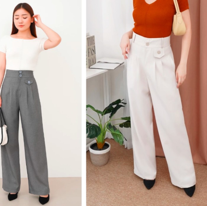 Cutting-nya wide dan panjangnya pas untuk memberi ilusi kaki lebih jenjang, dengan detail pleats rapi yang buat siluet terlihat lebih profesional. Bagian pinggang dibuat highwaist tanpa karet di belakang untuk tampilan yang lebih polished, dilengkapi kancing depan, ritsleting, dua saku samping, serta fake pocket kecil di bagian depan yang memberi aksen unik ala Korean style. Celana ini mudah dipadukan dengan blouse, knit top, atau blazer dan yang paling penting, bisa dipakai untuk berbagai suasana mulai dari kerja, casual hangout, hingga tampilan semi-formal.