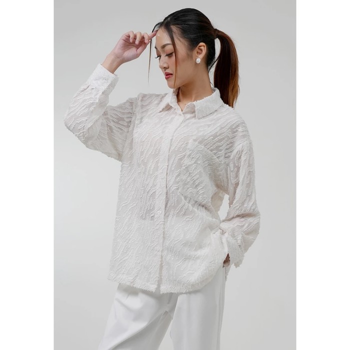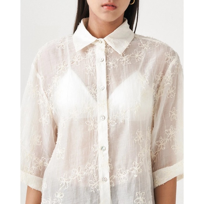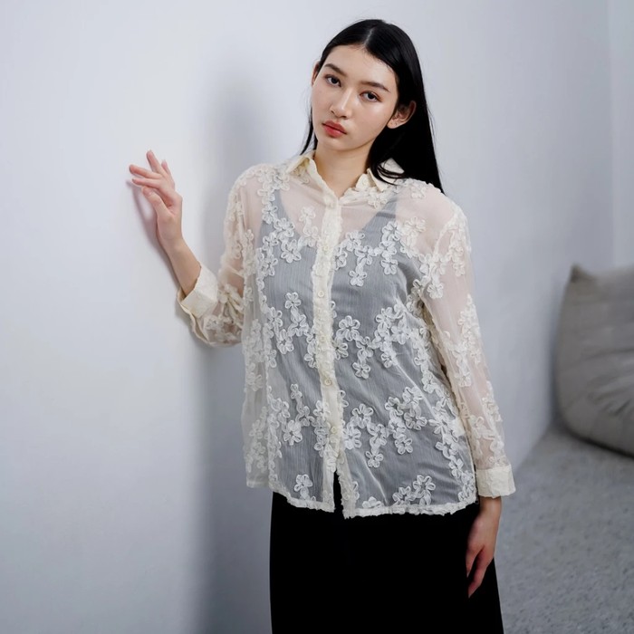 Tersedia dalam 2 warna yakni black dan ivory, kamu akan mendapatkan kemeja sheer dengan detail bunga yang menawan sekaligus mewah. Kemeja ini sangat ringan dengan no furing sehingga akan cocok untuk kamu yang ingin tampil layering.