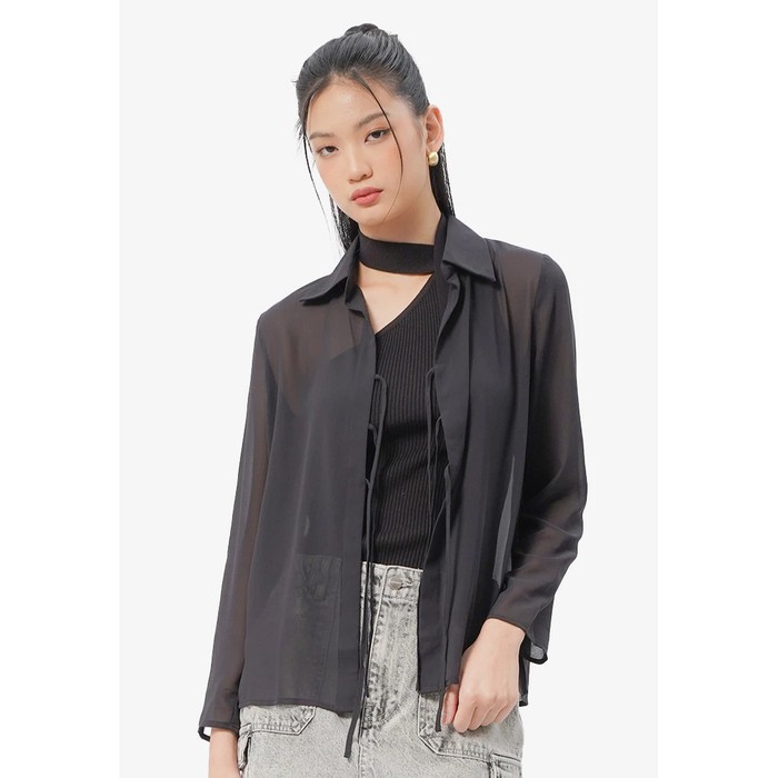 Ingin terlihat lebih edgy dan sangat versatile, kamu bisa mencoba The Front Sheer Shirt dari COLORBOX dengan warna hitam yang khas satu ini. Bukan menggunakan kancing, kemeja ini justru menggunakan tali untuk membuat penampilan kamu lebih memesona.