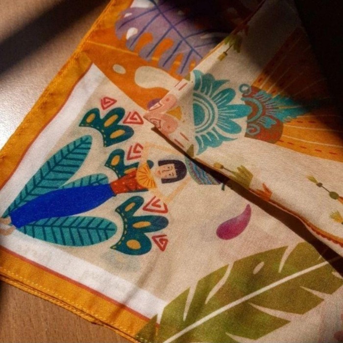 Desainnya dikemas dengan sentuhan batik, cocok untuk acara formal maupun kegiatan sehari-hari. Bahannya mewah menggunakan premium satin silk. Dengan ukuran 55 x 55 cm, mini scarf ini dapat digunakan sebagai syal maupun bandana.