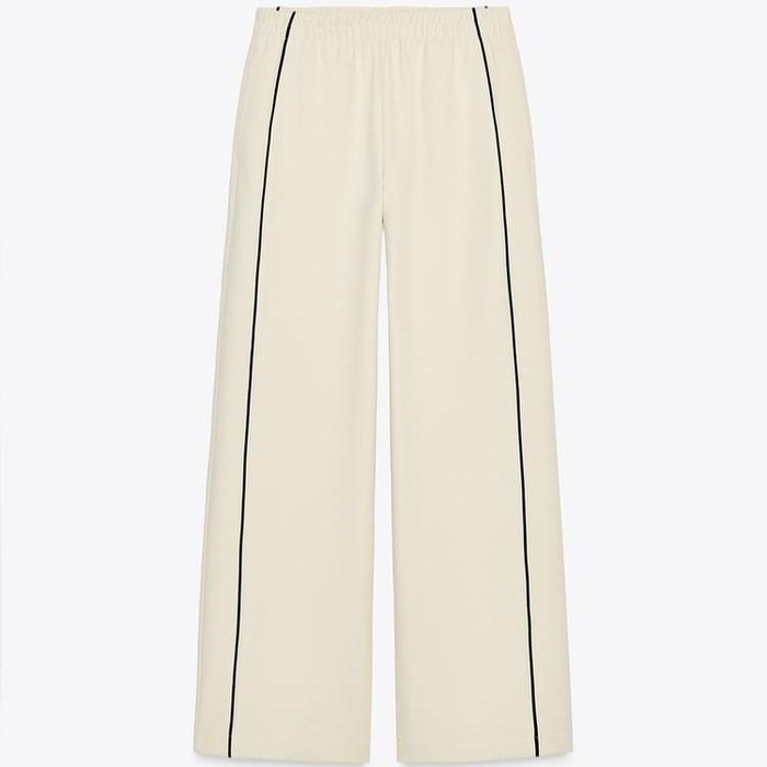 Jaket bomber ZARA di atas punya pasangan celana panjang model high waist, lho. Celana ini juga hadir dengan pinggang elastis dan detail bisban bernuansa kontras yang chic. Fungsional, celana panjang ini juga dilengkapi saku depan. Potongan kakinya lebar, sehingga memudahkan gerak ke sana kemari dengan gaya tetap santun dan tentunya kekinian.