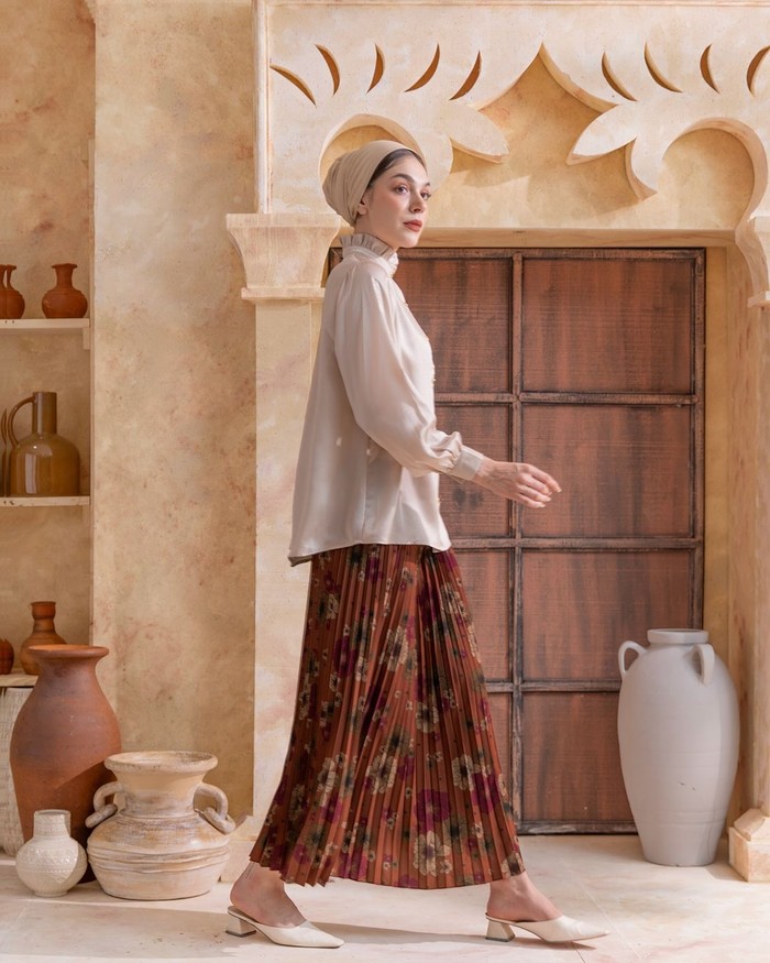 Pleated skirt akan jadi gaya klasik untuk hari raya. Koleksi Timia Skirt dari Ria Miranda hadir dalam motif print yang manis.