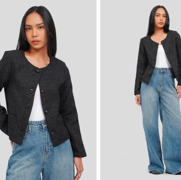 Blazer hitam adalah must-have item dalam capsule wardrobe, dan tweed blazer dari Executive ini menawarkan versi yang modern dan praktis. Dengan desain round neck tanpa kerah dan tekstur tweed yang elegan, blazer ini cocok untuk kamu yang ingin tampil rapi tanpa terlihat terlalu kaku.