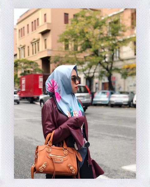 Cantik dan modisnya gaya Salmafina satu ini lho ladies. Gaya hijab simple dengan scarf motif bunga bikin wanita cantik berhijab ini terlihat elegan. Blouse maroon dengan potongan tangan terompet yang dikenakannya bikin Salma semakin modis dan fashionable. Dan gaya satu ini juga cocok banget buat kamu yang hobi traveling ke luar negeri.