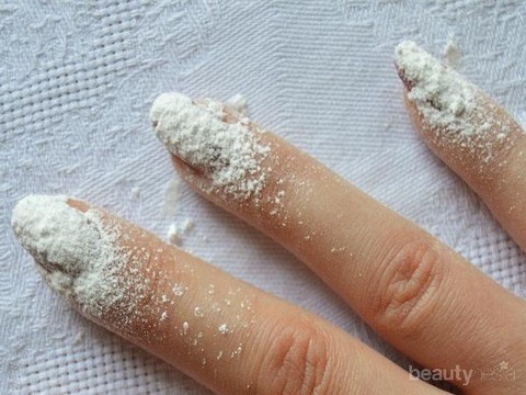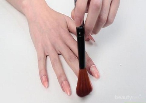 Ambil bubuk baking powder menggunakan kuas lembut kemudian sapukan pada kuku yang sudah diberi cat kuku yang masih basah. Untuk cara satu ini harap berhati-hati ya Ladies, jangan sampai rambut kuas menempel pada cat kuku kamu, dan pastikan baking powder merata.