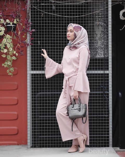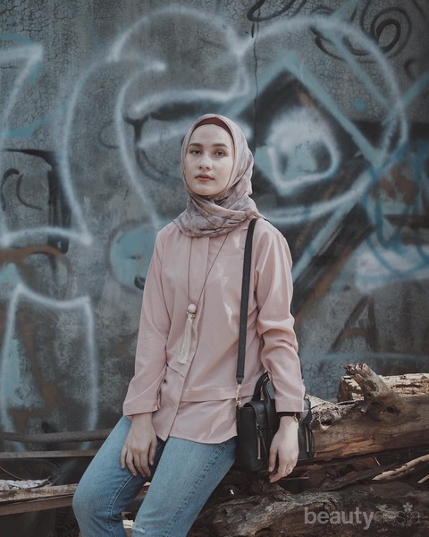 Gaya pertama yang bisa kamu contek adalah style kasual dari Mega Iskanti. Selebgram cantik yang satu ini memadukan hijab voalnya dengan drapery blouse berwarna pink muda. Meskipun warna hijabnya didominasi biru dengan kombinasi abu-abu, warna pink untuk atasan yang ia pilih membuat tampilan Mega terlihat semakin fresh dan manis. Ia juga memadukan basic pants abu-abu sebagai bawahan yang simpel.