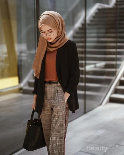 Blazer hijab polos akan tampak membosankan kalau tidak di mix dengan pintar. Kamu bisa mix and match blazer hijab polos dengan celana bahan kasual motif tartan atau kotak-kotak. Permanis penampilanmu dengan kacamata. Kamu siap jalani aktivitasmu di kantor!