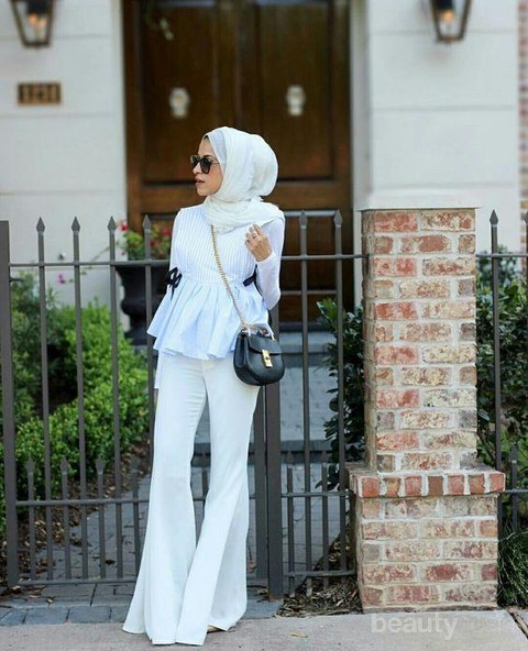 Selanjutnya, kamu juga dapat mencoba tampilan semi formal dengan menggunakan flare pants. Padu padan yang dapat kamu coba adalah blouse atau kemeja. Nah, kalau inspirasi yang berikut ini adalah perpaduan antara flare pants dan peplum blouse.