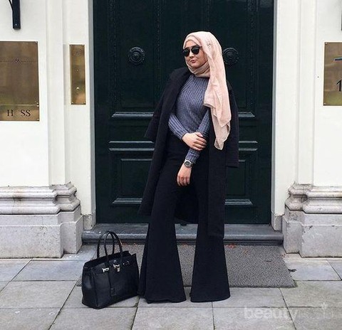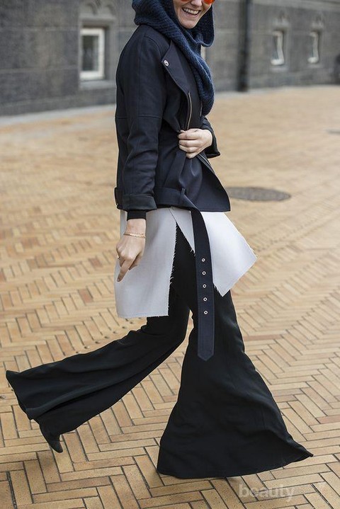Pergi ke kantor dengan flare pants di musim hujan? Kenapa tidak. Flare pants hijabers ini akan memberikan kesan modis dan feminine pada tampilan kerja kamu. Untuk melengkapinya, kamu dapat menggunakan sweater untuk inner blazer kerja yang biasa kamu gunakan.