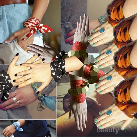 Bosan menggunakan scarf panjang di leher, di kepala, atau sebagai rompi? Kamu bisa juga memakai scarf yang lebih pendek sebagai gelang di tangan, untuk menampilkan kesan lebih santai. Scarf di tangan bahkan bisa dikombinasikan dengan arloji, gelang etnis atau manset maupun baju lengan panjang yang semi ketat. Agar tangan kamu terlihat lebih cantik, kamu bisa mewarnai kuku sesuai dengan warna scarf yang kamu pakai.