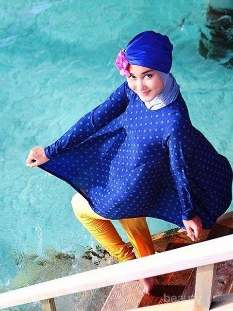 Jika model hijab turban kurang nyaman untuk kamu gunakan, kamu bisa mengintip gaya baju renang ala Amy yang satu ini. Ia menggunakan satu set baju renang muslim lengkap dengan hijab panjang menutup dada. Bahan material khusus yang digunakan membuat hijab ini tetap nyaman dipakai saat berenang dan bermain air.