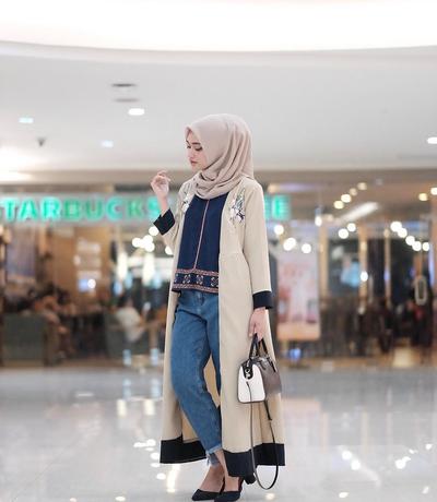 Fringe jeans saat ini sedang hits! Kalau kamu bingung bagaimana memadukan fringe jeans dengan nude outer panjang hijab, cukup lihat gaya Shella Alaztha berikut ini, ladies! Pilih atasan dengan warna yang berbeda dengan outer panjangmu serta pilih hijab yang memiliki warna senada dengan outer. Dengan pilihan gaya ini, outer panjangmu akan semakin terlihat menonjol!