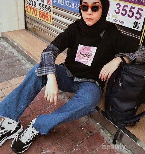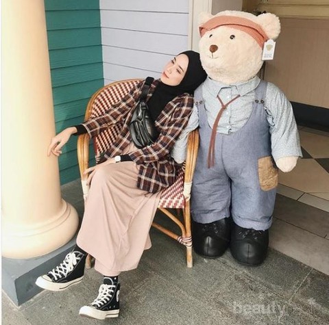 Meski berhijab, bukan berarti kamu harus meninggalkan model-model pakaian yang terbuka. Salah satu outfit model hijab yang tetap bisa kamu kenakan adalah sebuah blouse kotak-kotak berkerah sabrina dengan sebuah tali di bagian pundak seperti yang dikenakan Aghnia Punjabi. Tipsnya, kenakan blouse ini dengan sebuah manset yang akan menutupi bagian kulit yang terbuka. Style hijab ini tetap membuatmu terlihat sopan namun fierce.