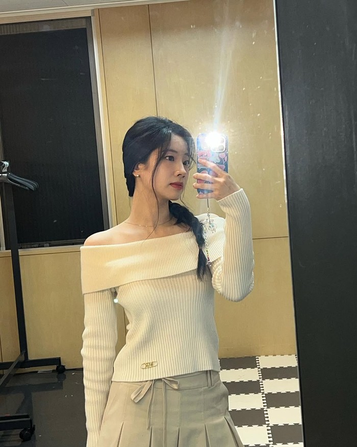 Mengusung konsep effortless chic, Dahyun memilih off-shoulder top yang nyaman dipadukan dengan pleated skirt polos nude. Off-shoulder top memberikan sentuhan feminin yang elegan, sementara pleated skirt menambah kesan anggun dengan siluet flowy yang cantik.