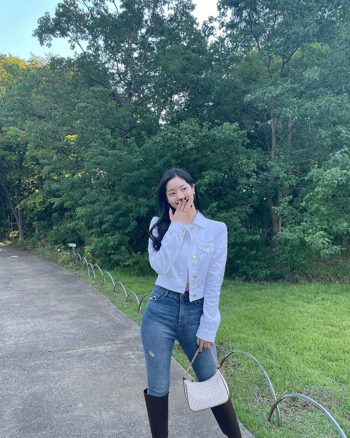 Untuk tampilan yang lebih bold, Dahyun memadukan crop tank top dengan outer jeans serta skinny jeans yang menonjolkan siluet tubuh. Kombinasi ini memberikan kesan kasual namun tetap fashionable, terutama dengan tambahan outer yang bisa dikenakan secara terbuka untuk tampilan yang lebih santai.Â