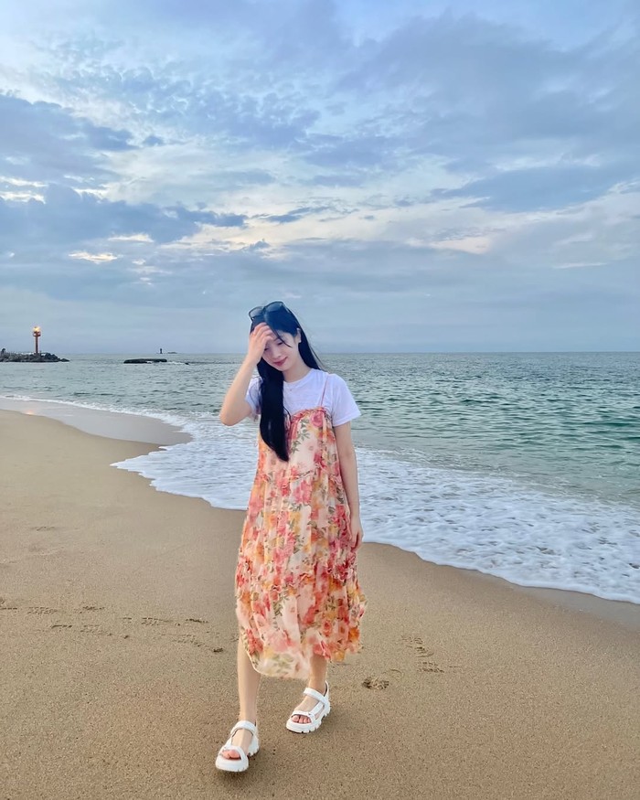 Dahyun tampil manis dengan paduan kaos putih sebagai inner dan dress tali bermotif floral yang memberikan kesan fresh dan feminin. Outfit ini cocok untuk tampilan santai yang tetap stylish, terutama jika dipadukan dengan sneakers putih atau sandal simpel.