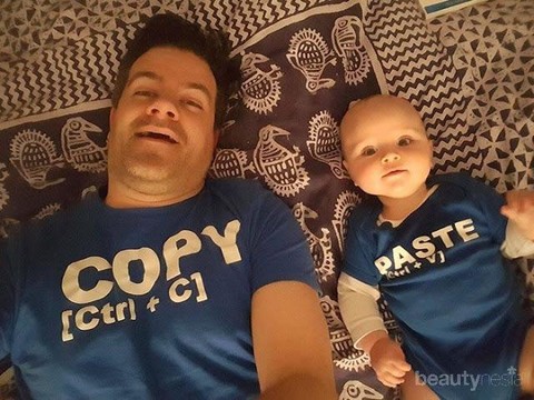 Kalau desain baju tadi cocok dipakai oleh ibu dan anak, lain halnya dengan desain yang satu ini. Desain ini cocok dipakai oleh ayah dan anaknya. Terinspirasi oleh sistem kerja komputer yakni copy paste, desain yang satu ini cocok banget menggambarkan bahwa memang anak adalah salinan dan mirip dengan orangtua mereka. Bikin gemas banget ya.