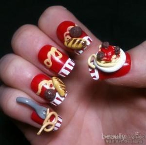 Wow! Bagaimana caranya ya makanan ala Italia ini bisa berada di atas kuku? Inovasi 3D yang satu ini keren banget ya ladies. Dari mulai pasta, garpu, dan juga daging, benar-benar terlihat seperti nyata. Nah, dari kelima inspirasi nail art di atas, kamu mau coba yang mana nih?