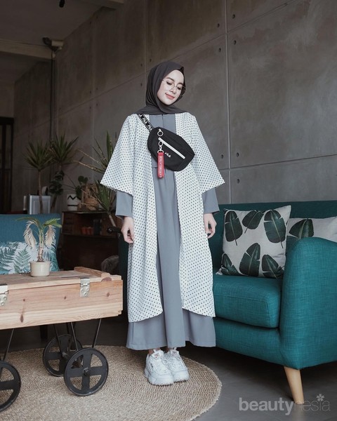 Kalau kamu adalah penyuka tampilan feminine dan sporty dalam satu gaya, cobalah untuk menggunakan kombinasi basic dress dan kimono outer. Kemudian jangan lupa untuk menyandingkannya dengan sepatu sneakers berwarna senada. Hasilnya, kamu akan mendapatkan gaya hijab dengan outer yang feminine dengan nuansa sporty yang manis.