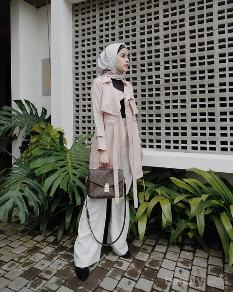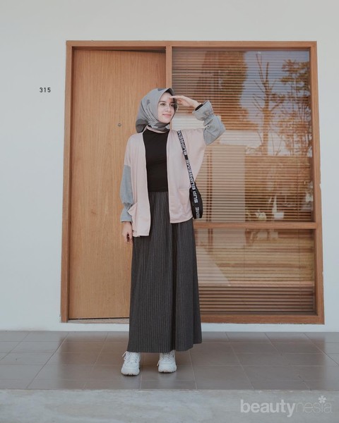 Terakhir, jika kamu adalah pecinta jaket parka, jangan lewatkan ide padu padan style parka dengan celana kulot yang dipakai Aghnia satu ini. Paduan warna peach nude memberikan kesan yang rapi dan formal dengan paduan heels hitam polos. Kamu dapat menggunaannya untuk gaya hijab ke kantor atau acara semi formal lain seperti arisan atau reuni.
