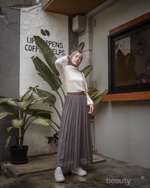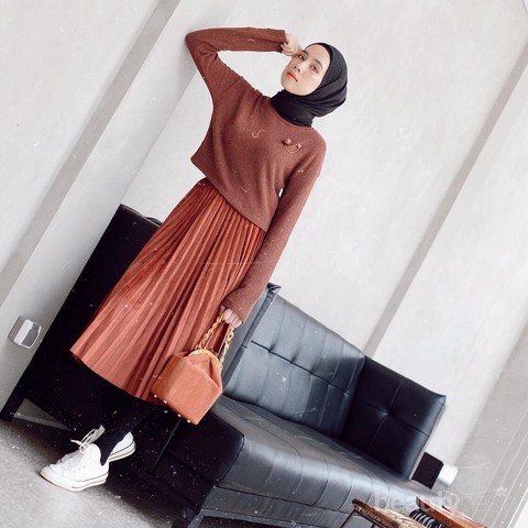 Selebgram cantik yang satu ini punya gaya mix and match rok lipit yang kece banget. Amelia memadukan rok lipit berwarna coklat dengan atasan polos berwarna teraccota senada yang simpel dan chic. Selebgram hijab ini juga memadukan roknya dengan legging hitam dan white sneakers. Finishing, tinggal kamu tambah tas warna senada dan pashmina hitam yang dililit rapi.