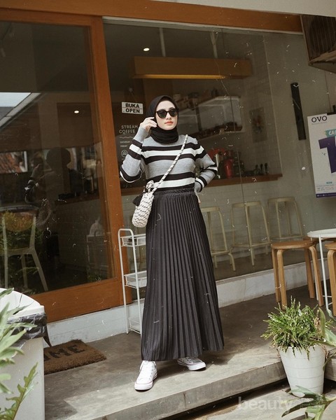 Selebgram hijab asal Bandung satu ini juga enggak kalah oke untuk diikuti lho ladies. Dengan rok lipit panjang, Amy terlihat feminim dan anggun banget. Mengusung konsep monokrom, rok lipit berwarna hitam ini cocok banget dipadukan dengan atasan bermotif garis dengan warna senada. Mix and match ini juga mudah kamu tiru ya ladies. Jangan lupa tambahkan aksesoris seperti sunglasses saat foto OOTD biar makin kece seperti Amy.