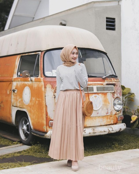 Memadukan rok lipit polos dengan atasan bermotif garis-garis? Intip aja nih gaya mix and match selebgram cantik, Sinta. Rok lipit berwarna coklat muda yang dipadukan dengan atasan bermotif garis-garis ini membuat penampilan kamu jadi lebih sederhana namun tetap anggun ladies. Dengan gaya busana ini kamu bisa kok pakai sepatu heels atau sneakers sesuai selera kamu. Tak ketinggalan tas rotan juga tersampir di punggung kirinya.