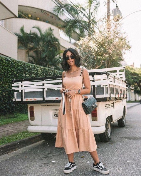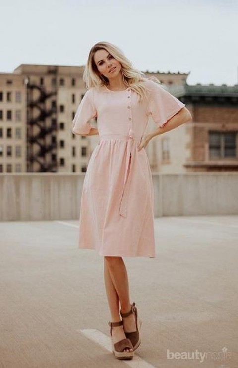 Selanjutnya dress warna pastel ini cocok jika kamu ingin tampil feminin karena berwarna pink muda. Lalu memberikan kesan lebih langsing karena ada kerutan pada bagian pinggang. Kamu bisa memakai high heels agar terlihat lebih jenjang Ladies.