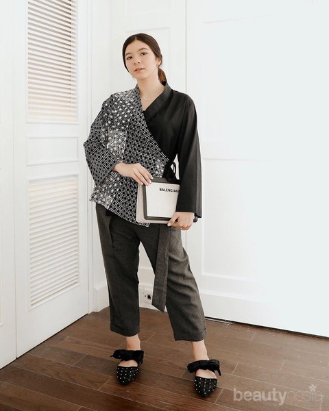 Foto: IstimewaUntuk kamu yang bosan dengan atasan formal yang itu-itu saja, kamu bisa lho coba tips fashion dari Shalom Razade yang memadukan kimono top dengan dress pants dan ballerina flats dengan aksen bow yang manis. Tampilan ini akan makin manis dan terkesan rapi jika kamu padukan dengan hand bag favoritmu untuk ke acara spesial. Tampilanmu juga akan tetap humble dengan pemilihan warna yang didominasi warna hitam dengan akses putih sebagai pattern-nya.