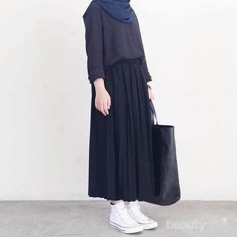 Foto: IstimewaSempurna! Rok plisket berwarna gelap yang senada dengan t-shirt polos yang di kenakan. Cocok banget nih untuk menyamarkan lipatan lemak pada tubuh. Makin kece dengan sneakers berwarna putih, chic abis!