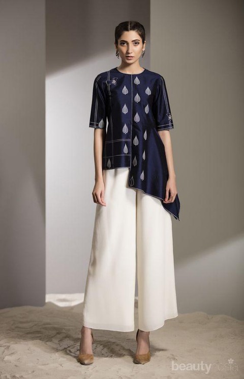 Warna navy bisa menjadi pilihan untuk kamu kenakan nih, Ladies. Untuk kamu yang memiliki kulit yang putih, warna ini tentunya akan sangat elegan untuk kamu gunakan. Kemudian padukan atasanmu dengan celana kulot berwarna putih.