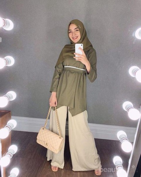 Warna krem memang selalu cocok untuk dipadu padankan dengan warna hijau army seperti pada potret ini. Kamu juga bisa menirukan outfit yang satu ini untuk dikenakan saat ingin menghadiri undangan teman maupun keluargamu. Selain itu, gunakanlah sepatu heels agar penampilanmu terlihat lebih anggun.