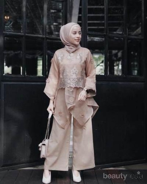 Jika kamu kehabisan ide untuk model outfit kondangan, kamu bisa menggunakan brokat shirt seperti ini, Ladies. Pada bagian bawahnya, kamu bisa memadukan dengan celana kulot yang berwarna senada. Untuk kamu yang menggunakan hijab, gunakanlah hijab dengan bahan satin velvet yang juga senada dengan outfit-mu. Jadi, kamu tetap bisa tampil cantik tanpa harus ribet menggunakan rok.