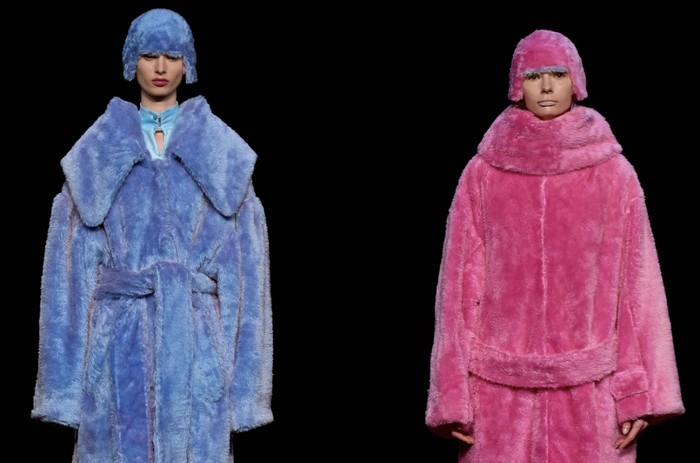 Pewarnaan faux-fur menggunakan sinar UV perdana ditampilkan dalam peragaan ini. Selain dari faux-fur coat bercetak monogram, sejumlah robe bulu dipresentasikan dalam warna lebih berpigmentasi di penghujung peragaan busana, yaitu biru dan merah jambu yang seragam dengan topi.