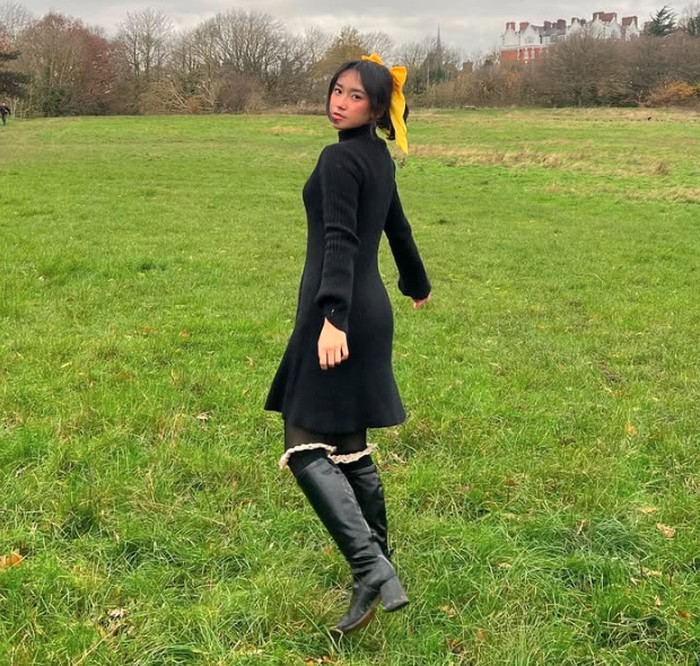 Dalam suasana musim gugur, Freya tampil memukau dengan dress knit berwarna hitam berpotongan A-line yang memberikan siluet ramping dan elegan. Sentuhan feminin makin terasa lewat lace stocking dan sepatu boots tinggi berwarna hitam yang mempertegas kesan chic. Tak lupa, pita besar warna mustard yang menghiasi rambutnya membuat penampilan ini terlihat seperti potongan dari film indie berlatar Eropa. OOTD ini cocok untuk kamu yang ingin tampil anggun, namun tetap nyaman di cuaca dingin.