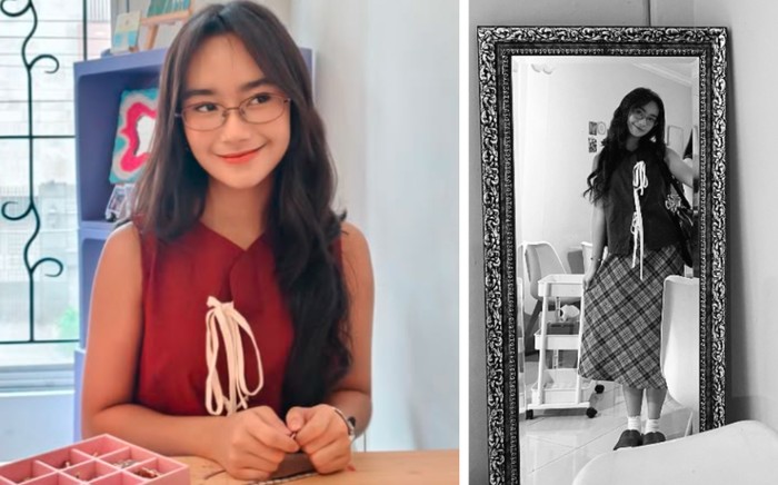 Freya tampil imut dengan sleeveless top merah bergaya pita yang dipadukan dengan rok midi kotak-kotak. Rambut panjang dan kacamata yang ia kenakan membuat tampilannya terlihat pintar dan stunning, cocok untuk gaya vintage aesthetic ala Tumblr girl. Cocok untuk kamu yang ingin tampil feminin dan artsy di lingkungan kampus atau saat photoshoot kasual bersama sahabat-sahabatmu!