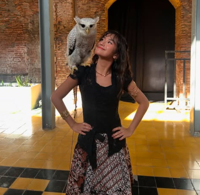 Freya tampil menawan dalam balutan kebaya modern berwarna hitam dipadukan dengan kain batik etnik. Penampilannya makin memesona dengan hadirnya burung hantu di bahu, memberi kesan eksotis dan powerful. Outfit ini menggabungkan unsur budaya dengan sentuhan elegan yang kekinian. Sangat cocok dipakai untuk acara formal, photoshoot, atau festival budaya yang ingin tetap modis tapi tidak kehilangan identitas lokal.