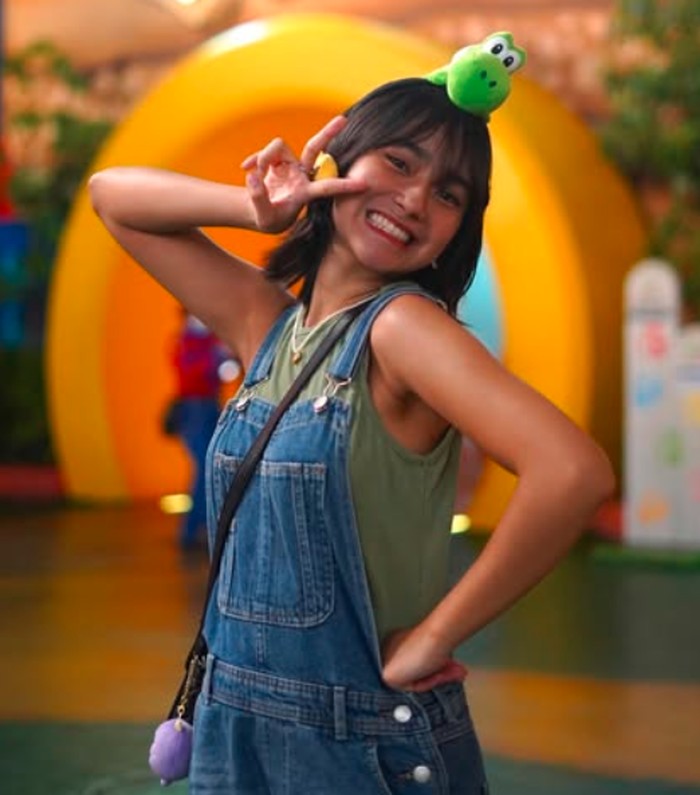 Tampil kasual dan penuh energi, Freya memilih denim overall pendek yang dipadukan dengan tank top hijau army. Aksen lucu seperti headband karakter Yoshi dan tas kecil plushie menjadikan outfit ini terlihat menggemaskan sekaligus fresh. Outfit ini cocok untuk kamu yang ingin tampil playful saat main ke theme park atau hangout di akhir pekan. OOTD ini adalah definisi sempurna dari gaya fun and youthful.