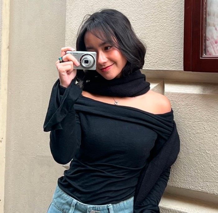 Tampilan ini membawa nuansa klasik ala Parisian girl yang santai tapi tetap modis. Freya mengenakan long sleeve off-shoulder top warna hitam yang dipadukan dengan jeans high waist dan scarf senada yang melilit lehernya. Rambut pendek yang sedikit bergelombang serta kamera vintage di tangan membuat outfit ini sempurna untuk kamu yang suka look artsy namun tetap simpel. Bisa dijadikan outfit jalan-jalan atau ngopi santai di akhir pekan.