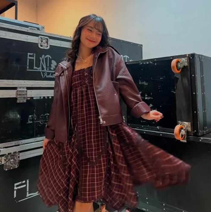 Freya menunjukkan sisi edgy-nya dengan paduan dress bermotif kotak merah marun yang flowy dipadukan dengan jaket kulit warna burgundy. Outfit ini memberi kesan bold dan sedikit retro, ditambah lagi dengan ekspresi Freya yang percaya diri dan playful. Gaya ini sangat pas untuk kamu yang ingin tampil standout saat hangout malam hari atau acara kasual semi-formal.