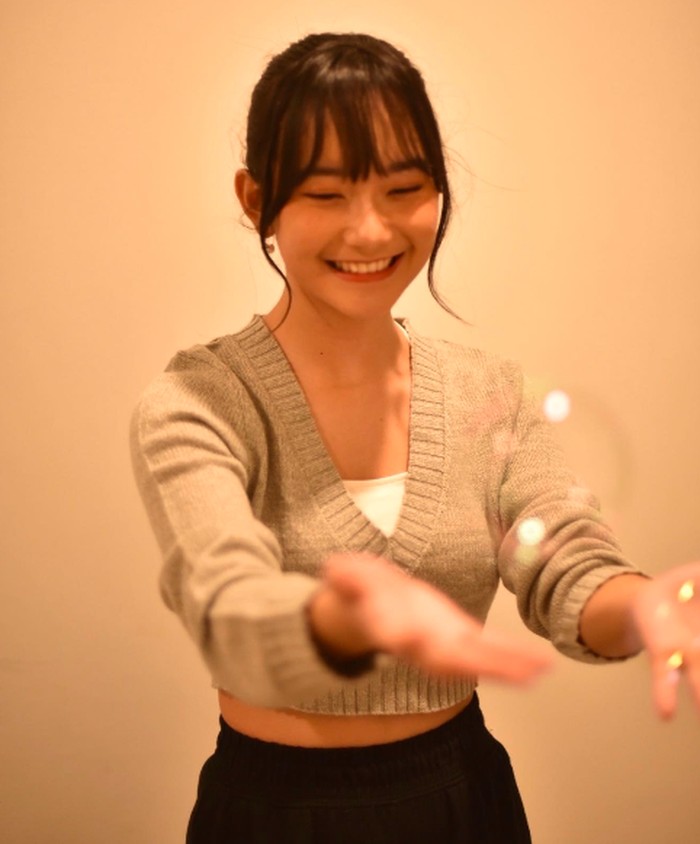 Gaya manis dan nyaman ini datang dari kombinasi cropped knit sweater warna abu-abu muda dengan celana sporty hitam. Freya tampil sederhana namun tetap modis dengan potongan rambut ponytail dan ekspresi bahagia. Gaya ini super cocok untuk aktivitas indoor seperti nonton bareng, kumpul di rumah teman, atau sekadar me time. Simpel tapi tetap stylish, ya!