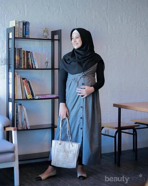Meski Nina Zatulini sedang mengandung, dia tetap memakai busana yang fashionable, lho! Kita lihat saja gaya berpakaiannya kali ini, dia memakai dress model overall dengan warna dasar abu-abu, lengan berwarna hitam, hijab langsung pakai berwarna hitam, flat shoes warna nude dan ujung hitam, dengan tas Gucci Chanelnya yang berwarna silver.