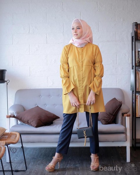 Berikut ini salah satu outfit yang dia pakai, terlihat santai namun anggun, dia berani memadukan banyak warna dalam setelan outfit kali ini. Dia memakai baju model tunic berwarna kuning kecokelatan, celana kain panjang berwarna biru donker, hijab berwarna pink, high heels berwarna nude, dan tas YSL berwarna biru donker senada dengan warna celananya. Wah keren sekali, bukan?