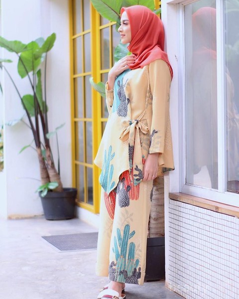 Jika kamu suka dengan warna cerah namun tidak mencolok, kamu bisa memakai baju set berpola kaktus seperti Nina Zatulini, lho! Warna dominan dari baju set yang dipakai berwarna nude dengan corak warna-warni dari kaktusnya akan membuat kamu terlihat makin menakjubkan.